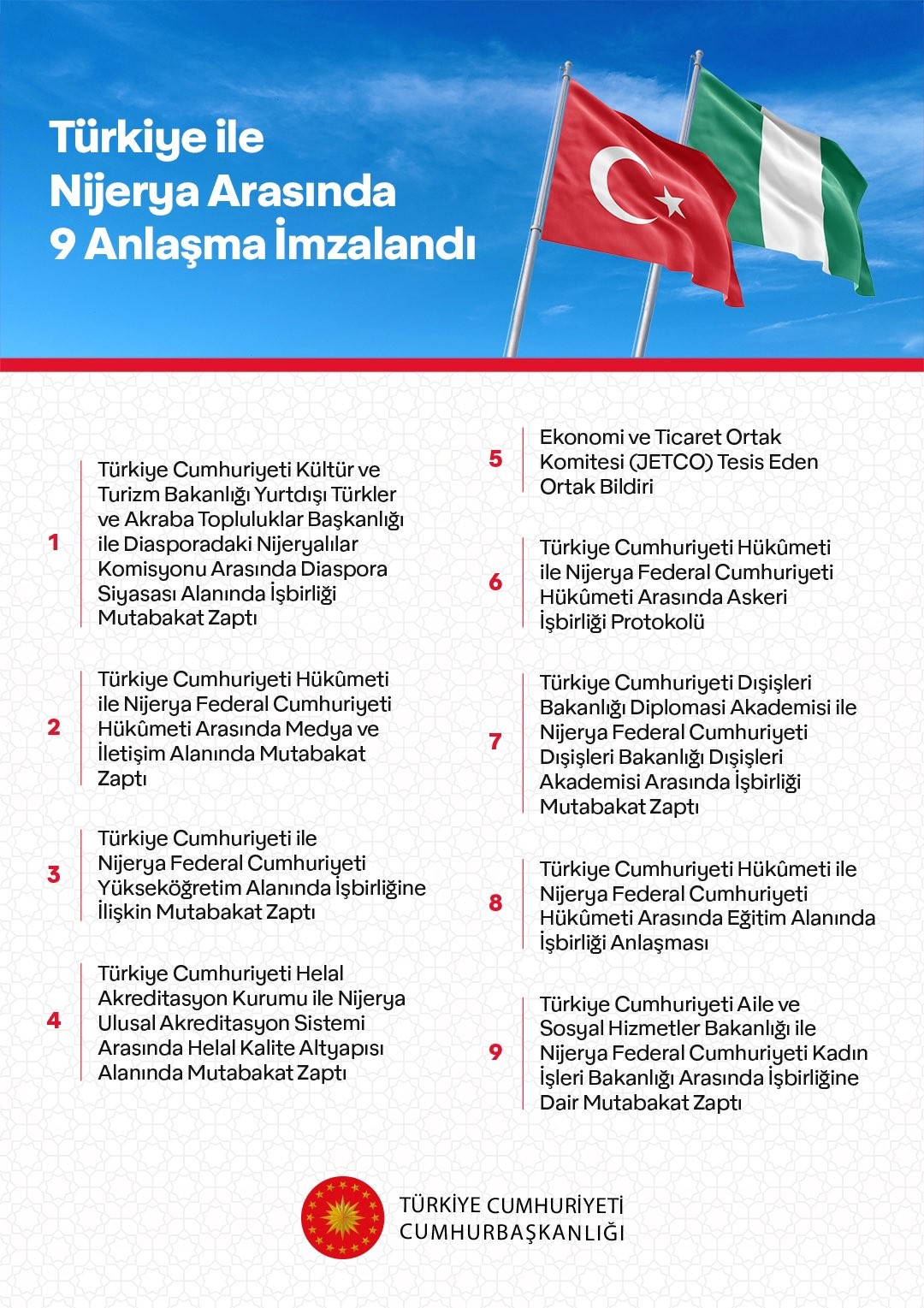 Cumhurbaşkanı Recep Tayyip Erdoğan ile Nijerya Cumhurbaşkanı Bola Ahmed Tinubu’nun Ankara’daki görüşmeleri sonrası; savunma, ekonomi, eğitim, medya, diplomasi ve sosyal politikalar başta olmak üzere geniş bir yelpazede 9 anlaşma imzalandı.